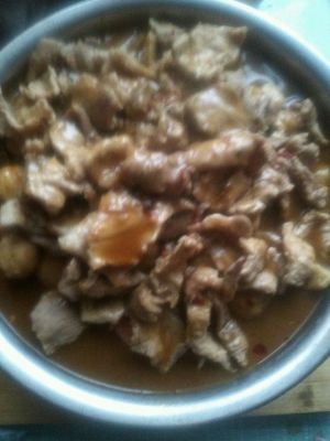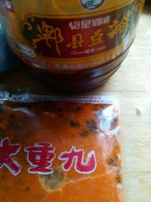 郫县豆瓣剁细上热油炒至出红然后入老抽一点生抽料酒适量盐鸡精适量加入水煮至大开