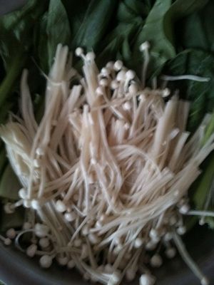 油菜煮好了,却感觉比生的时候少了好多啊。现在煮的是金针菇。