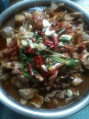 把白菜叶香菜扑锅底再扑入葱段辣椒煮好的肉片导入锅中撒姜末蒜末干辣椒花椒最后以烧好的热油一淋,滋滋油响中菜就做好了,上桌看看:-D