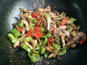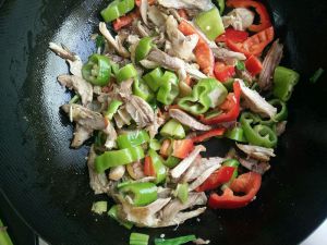 加入青椒,继续翻炒。