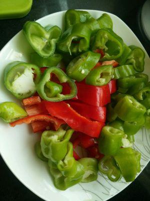 干辣椒,青红辣椒洗净斜刀切好备用。