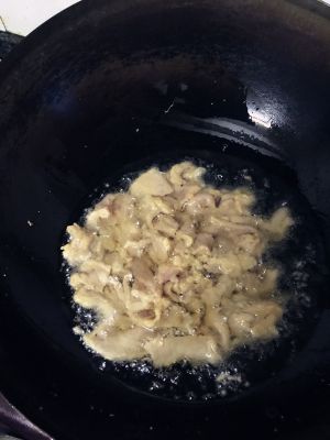 热锅下油,待油滚热下肉片关火,将肉片拨散。