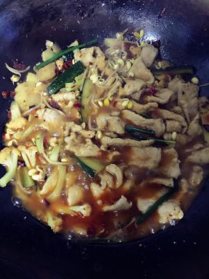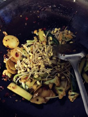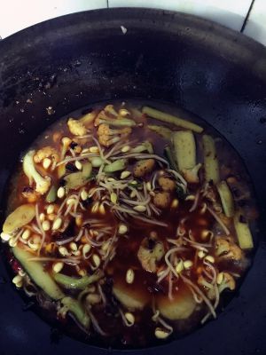 倒入黄瓜、土豆片、花菜、豆芽翻炒,加入少量盐、料酒,鸡精、火锅底料,剁辣椒、油辣子,继续翻炒。