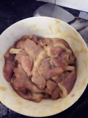 里脊肉切片,用盐,料酒,蛋白,淀粉淹20分钟备用