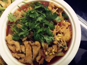 麻辣汤底倒入滑好的肉片再煮透,连汤起锅舀在配菜之上,撒蒜粒和葱节。