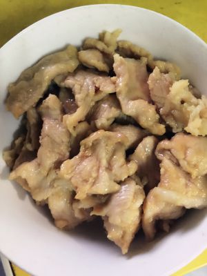 将瘦肉切薄片,加入盐、鸡精、香油、花椒油、酱油、生粉、胡椒粉抹匀腌制几分钟。(作料注意用量)
