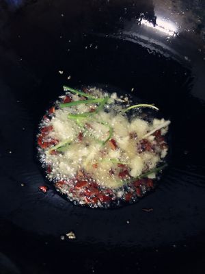 锅里留适量油,放入姜片,蒜,葱、辣椒,花椒爆香。