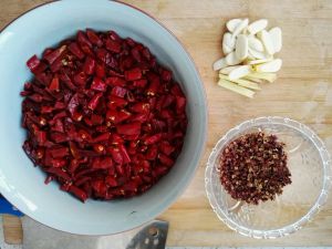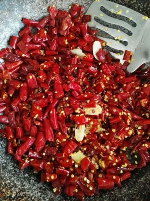 入味的时候,把朝天椒切段,蒜切片,姜切丝。