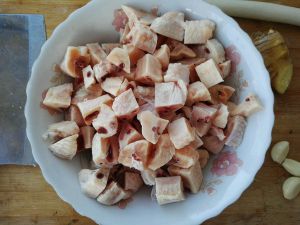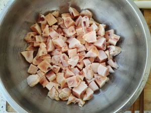 鸡胸肉切丁,加料酒,生抽,胡椒粉,盐,淀粉准备腌肉