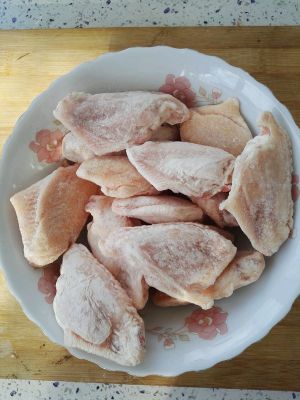 本来打算买鸡腿的,但是没有了就买的琵琶腿。首先把琵琶腿洗干净,剁成小块,然后多换几遍水泡泡血水。然后把鸡腿拧几下沥干水分