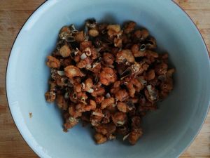 加鸡块中火炒香,加盐鸡精和芝麻调味