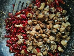 锅中留底油,放花椒炸香后捞出,再放葱花,姜丝,干辣椒,青椒,小米椒炒香,加入刚才炒好的鸡丁翻炒