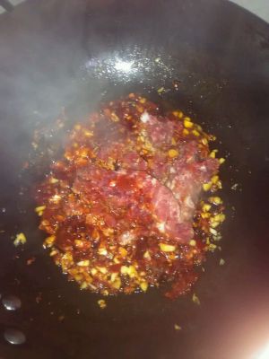 锅里放油,花椒麻椒炒香,捞出来。在放蒜姜沫,和郫县豆瓣酱炒一两分钟。