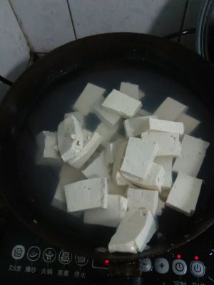 豆腐切小块,先在开水中煮几分钟,去除豆腥味。