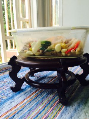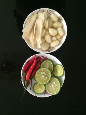 所有的材料全部放进容器里(姜片、白酒也要放的),先放一些盐,糖一小把加矿泉水和匀。