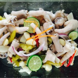 锅里加水,放入花椒、大料、姜片(也可以倒点料酒),煮开后放入鸡爪,再煮八至十分钟。捞出鸡爪过凉,洗净。准备一个保鲜盒,将泡椒连同泡椒水与凤爪一起倒入,泡椒水要淹没凤爪。放冰箱冷藏室冷藏