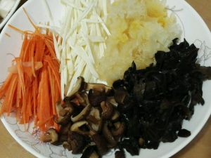 把泡发的香菇、木耳、银耳、胡萝卜、茭白切丝