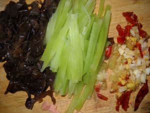 泡椒、泡姜切丁,蒜切丁,木耳,莴笋切丝,肉丝