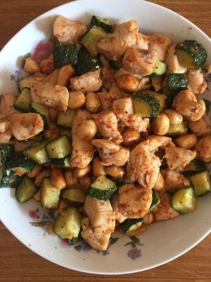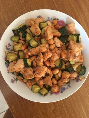 下鸡肉,出锅前加黄瓜和花生。