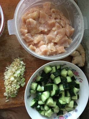鸡胸切块,放料酒,盐,淀粉腌十分钟,黄瓜切块,葱姜蒜切末