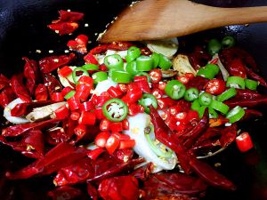 继续用刚才的油(或另起油锅),依次放入姜蒜,干辣椒,花椒和红绿辣椒,煸炒出香味