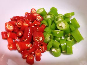 将辣椒切段(不宜太小),可以趁煮鸡丁的时间切段,也可之前准备好。