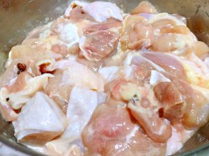 姜蒜切片(随意),土豆切丁,辣椒切段。鸡肉用姜,花椒,酱油,适量的盐,淀粉腌制