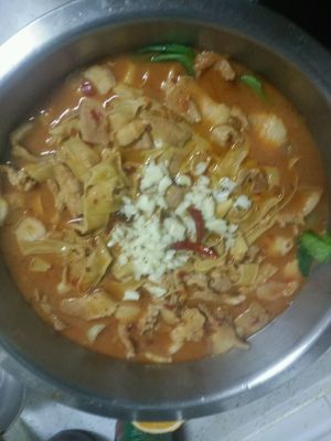 洗锅,下油,八成热时先放姜、蒜炝锅,再放郫县豆瓣、花椒、藤椒同炒,加半瓢水,再放适量酱油、料酒、糖、大料粉。水开后放入滑好的肉片,煮透后连汤起锅倒在炒好的豆芽、金针菇之上,撒入葱花。
