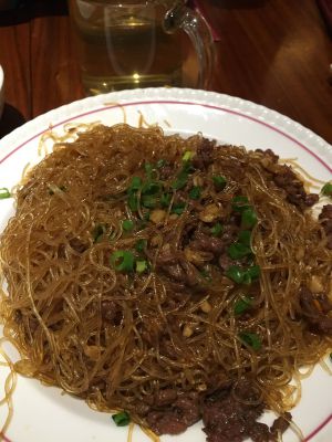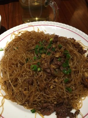 放入一勺香其酱'然后放肉末'加入酱油等调料'最后放入粉丝不停翻炒'出锅前加少许葱花
