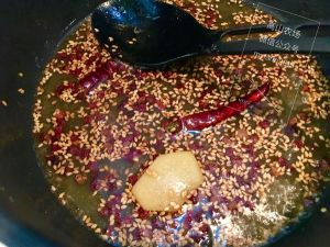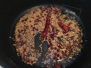 热锅冷油放入芝麻,花椒,干辣椒,盐煸炒出味