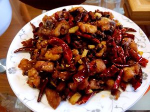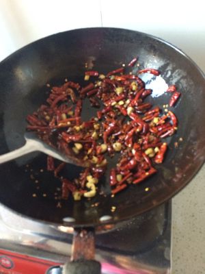 锅内适量油烧热,加入姜蒜、辣椒、花椒等(一定要小火爆锅,不然干红椒很容易就糊了。)煸出香味后加入炸好的鸡丁,继续翻炒。