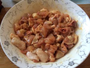 鸡胸肉切丁,加料酒,生抽,蚝油,少量盐抓匀,码味一个小时左右。