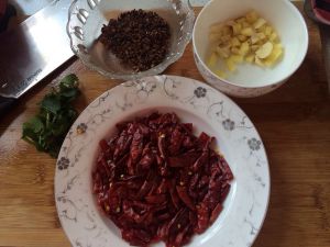 备好干红椒切段儿(多一些)、花椒适量、八角一个(掰碎)、姜蒜切好备用