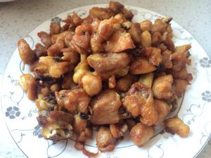 下入已经炸好且沥干油的鸡丁肉,以及适量的生抽,翻炒均匀。