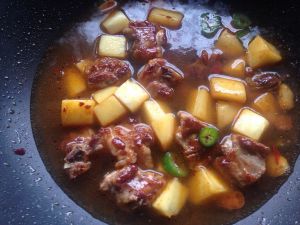 后加入土豆块,混入骨头,任其煮7~9分钟!在起锅的1~2分钟时加入所有调料,翻匀,起锅就可以了