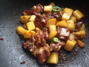 炒到排骨表面变色后,加入土豆、2勺孜然翻炒均匀,最后加一盘水,大火收汁出锅