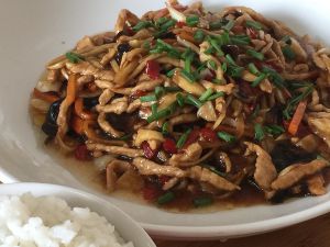 锅中继续放油,放入蒜爆香,加入郫县豆瓣酱翻炒出香味,加入料酒,老抽和白糖翻炒后倒入切好的尖椒丝,胡萝卜丝好木耳丝翻炒再加入里脊丝翻炒。