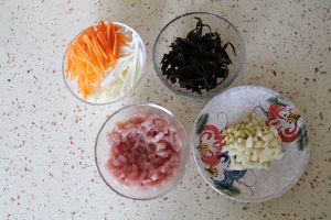 准备好 胡萝卜 青椒 木耳切细备用 肉丝切好备用