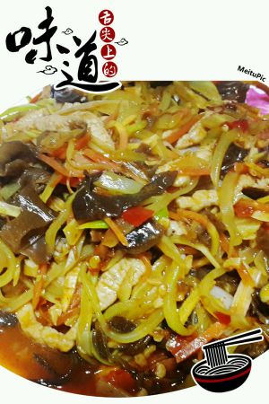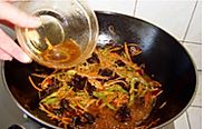 翻炒均匀后加入炒好的肉丝和调好的芡汁,大火翻炒收汁。