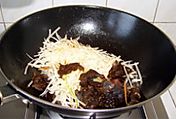 炒锅放适量油,油热爆姜汤姜,把肉丝炒熟,不要偷懒,肉丝要乘出来,要不然炒太久肉丝会很老