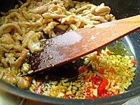 倒入调好汁翻炒均匀后,最后放入素肉丝翻炒均匀即可