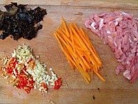 所有食材切丝,稍微细一点,尤其姜丝,和这菜灰常好吃,我喜欢稍微多放一点点姜,正版鱼香肉丝是泡姜,家里没有,生姜就可以,味道影响不大,蒜切末就可以