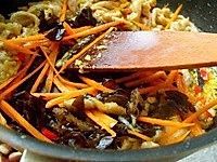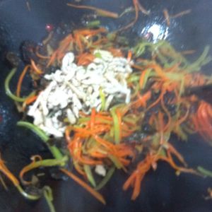 然后保持肉丝在旁边的状态,下胡萝卜和木耳丝炒至断生,在蔬菜里下约1g盐。然后烹入之前的滋汁,合匀,起锅前加入葱花