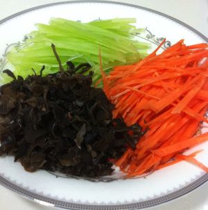泡发木耳。胡萝卜、莴笋、木耳切丝。
