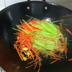 锅中下入胡萝卜丝和莴笋丝翻炒。