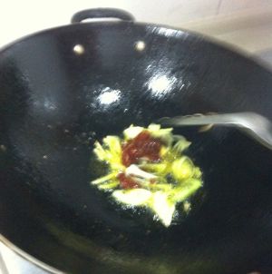 锅中下油,冷油放入葱姜丝,开小火煸炒20秒,加入一勺郫县豆瓣酱继续煸炒,炒出香味后转大火。