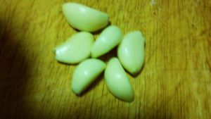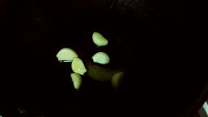 油锅加热,放入6瓣大蒜,中火焙香,至蒜色变深
