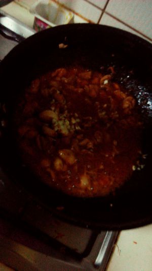 转小火,剩余的油放甜面酱煸炒,炒一会把鸡混合炒,倒入少许醋,老抽上色,盐,土豆翻炒。放入辣椒,蒜片,炒一会