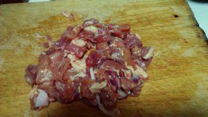 鸡腿肉去皮,去骨,用刀背断筋后,切成小方丁备用