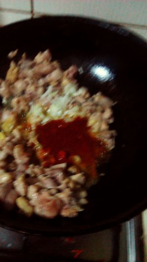 锅热多放油,放花椒八角,葱姜,倒入鸡块翻炒,炒干水分后,把鸡放一边。